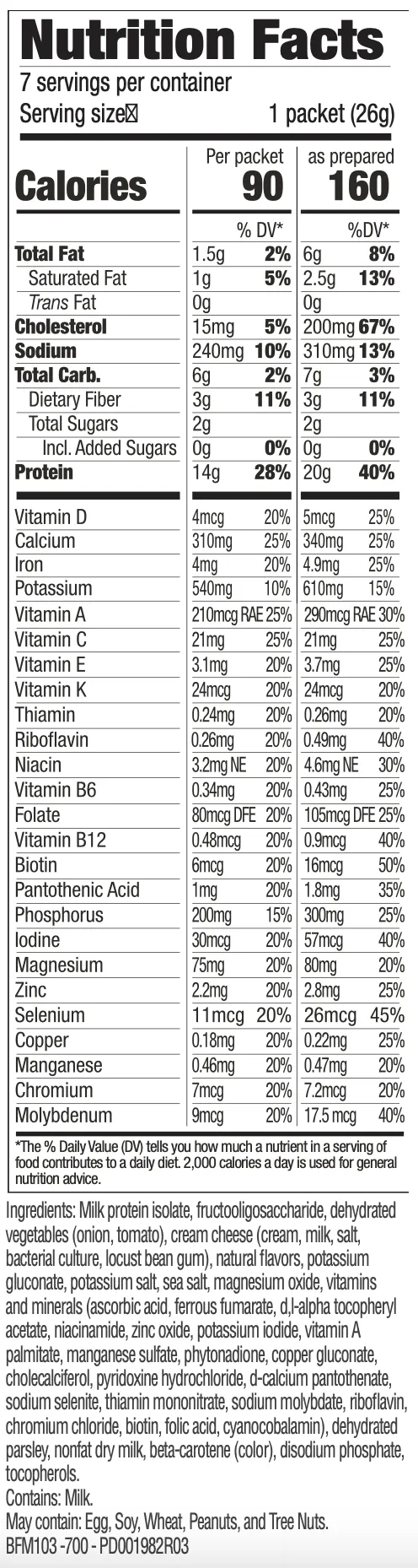 Skip the complicated breakfast prep. Our Southwest Egg Scrambles pack 14g of protein straight out of the box—combine with one fresh egg and you've got 20g of protein, the nutritional equivalent of three large eggs.